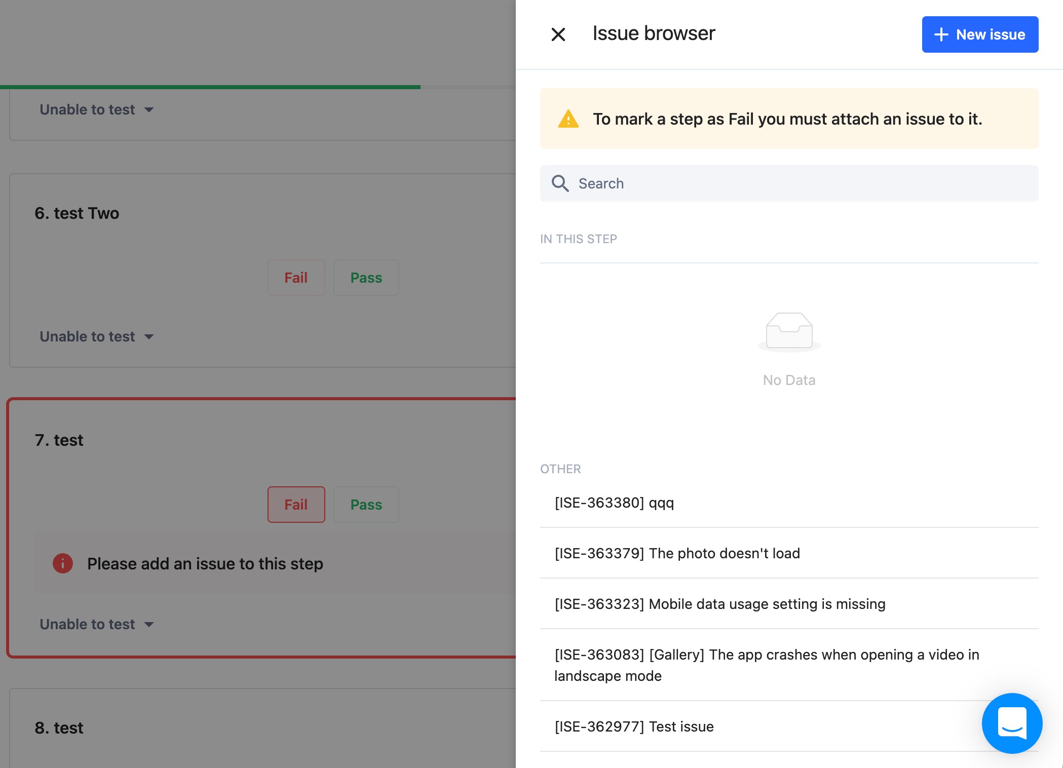 Once you click the Fail button, an issue browser will open where you can look for duplicate issues to reproduce or create a new issue