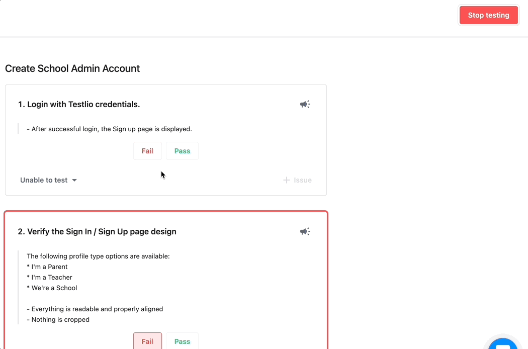 When testing an app, if a step fails or it is not possible to test the step due to an issue, testers should report an issue. Before reporting a new issue, the testers need to make sure that their issue is not a duplicate of an issue that has already been reported. See how to look for duplicates