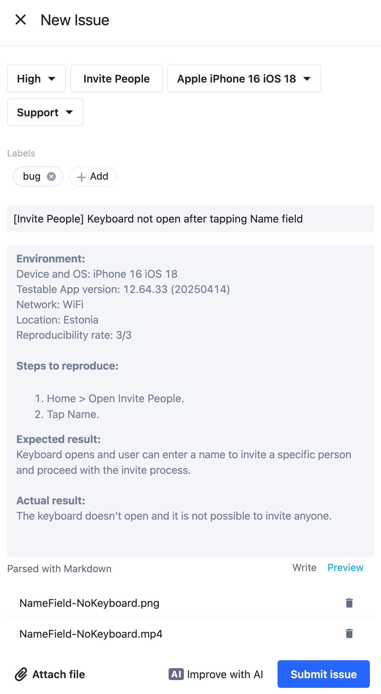 Attachments are required. Videos must be high quality, in .mp4 format, not too large, and in portrait mode and match the steps to reproduce.