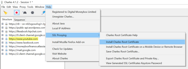 In Charles go to the Help menu and choose "SSL Proxying > Install Charles Root Certificate". A window will appear warning you that the CA Root certificate is not trusted.
