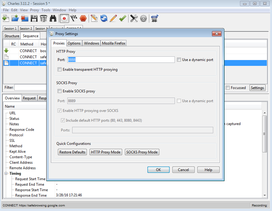 After opening Charles Proxy go ahead and disable Windows Proxy / MacOS Proxy / Mozilla Firefox Proxy (they are enabled by default) as this will just generate extra data that is not needed when you are testing through a mobile device. Also, no need to install the Firefox plugin.