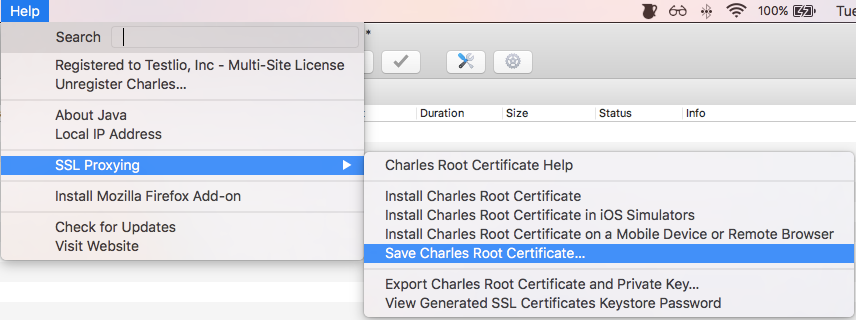 5. Open Charles and navigate to Help -> _SSL Proxying -> Save Charles Root Certificate.