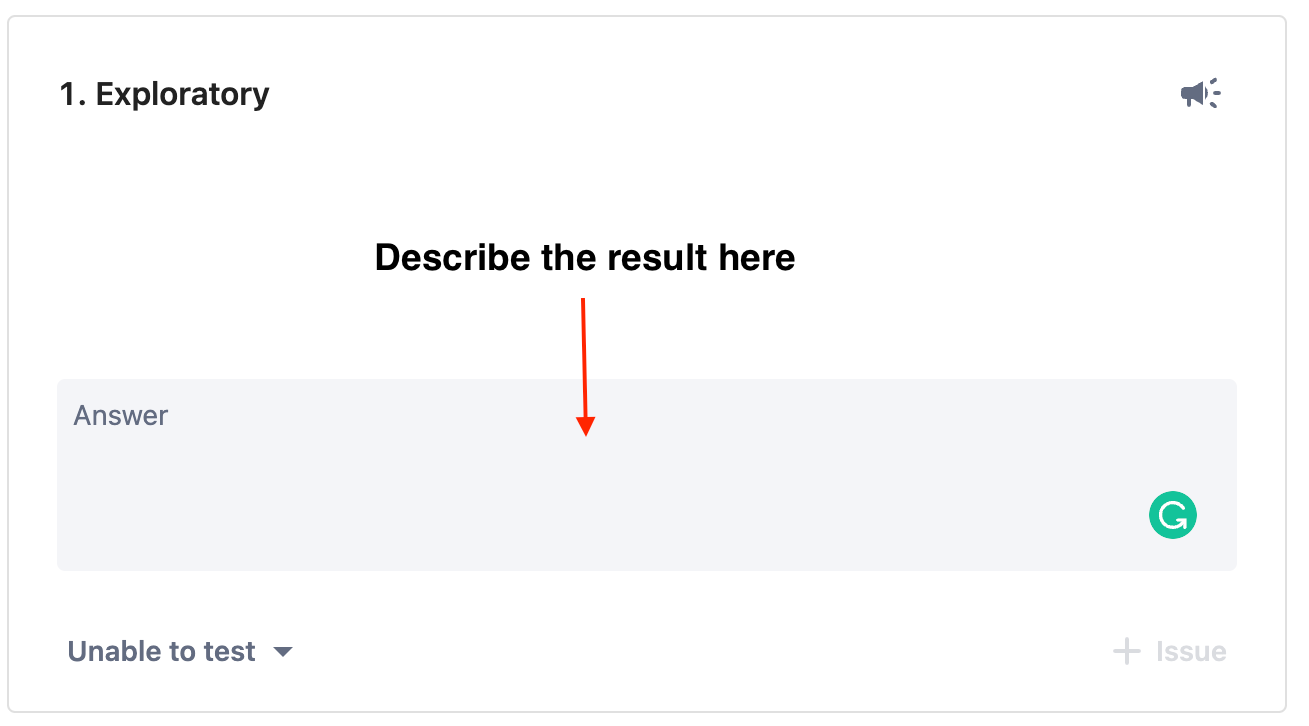 As testing strategies are not specified in the exploratory tests, testers must describe their work process and result in the provided text box as shown in the picture below: