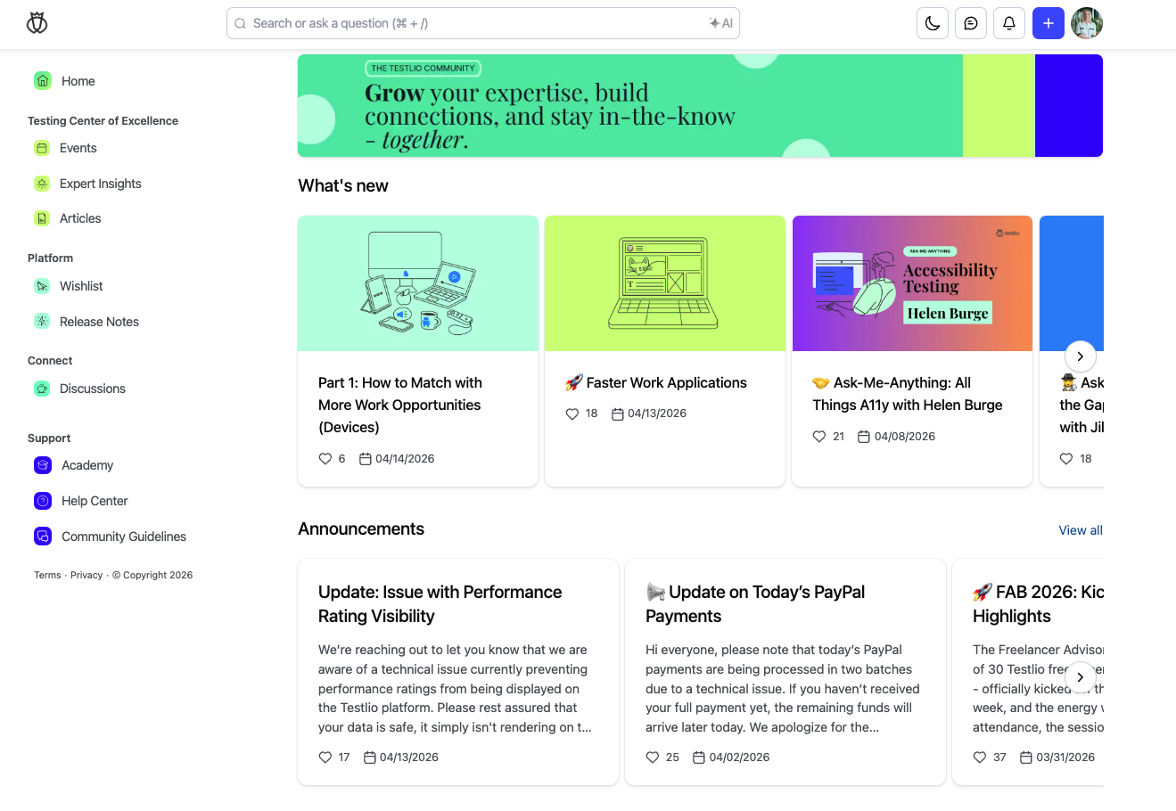 To join the Testlio Community, go to community.testlio.com. If you're not already logged in, log in to your Testlio platform account to access it.