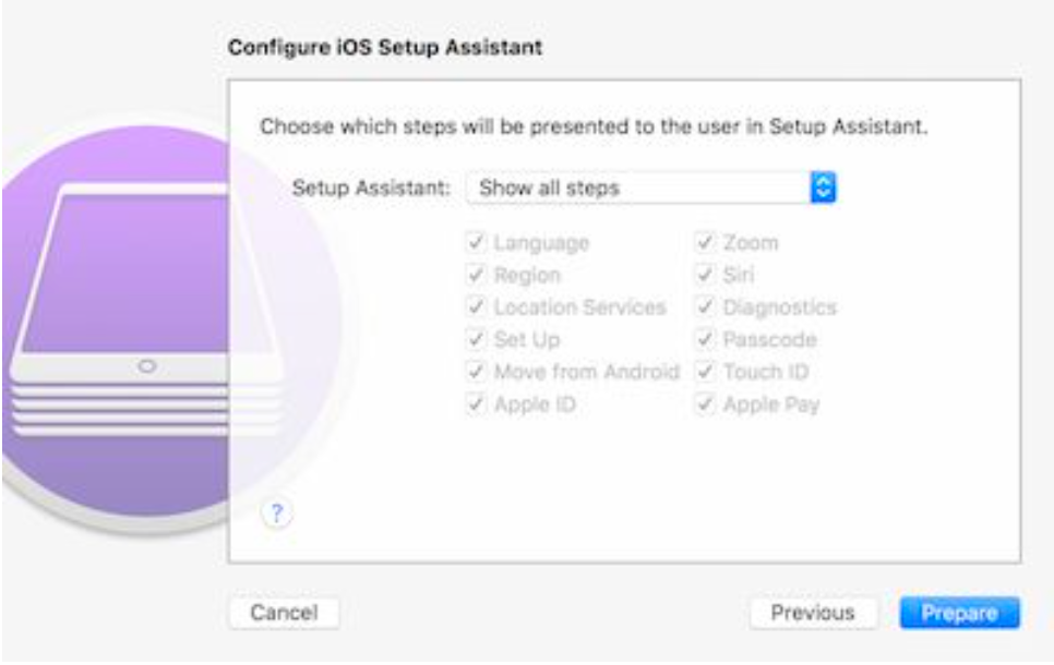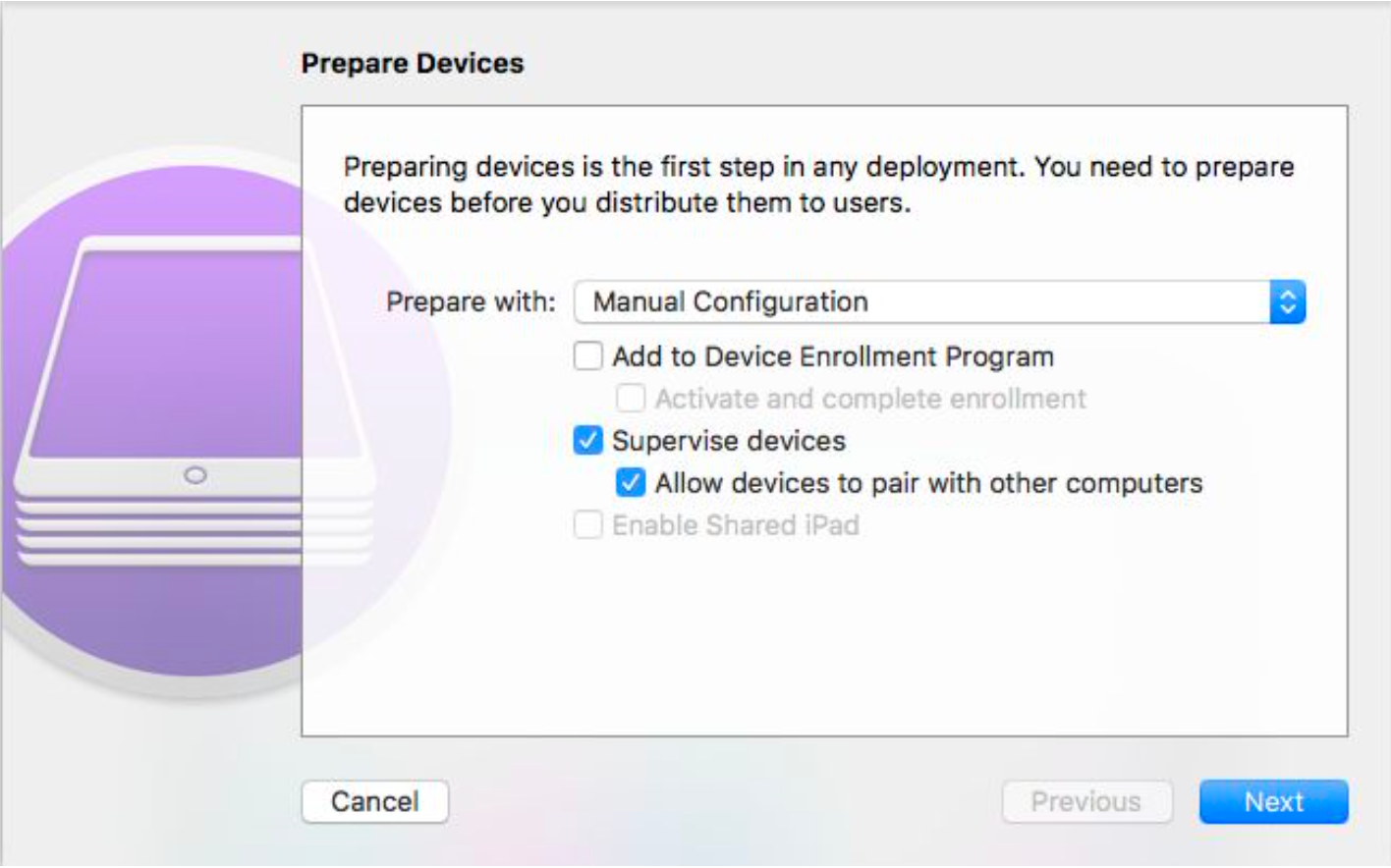 Select Prepare with: ‘Manual Configuration’ and select the checkboxes for ‘Supervise devices’ and ‘Allow devices to pair with other computers’, uncheck all others.