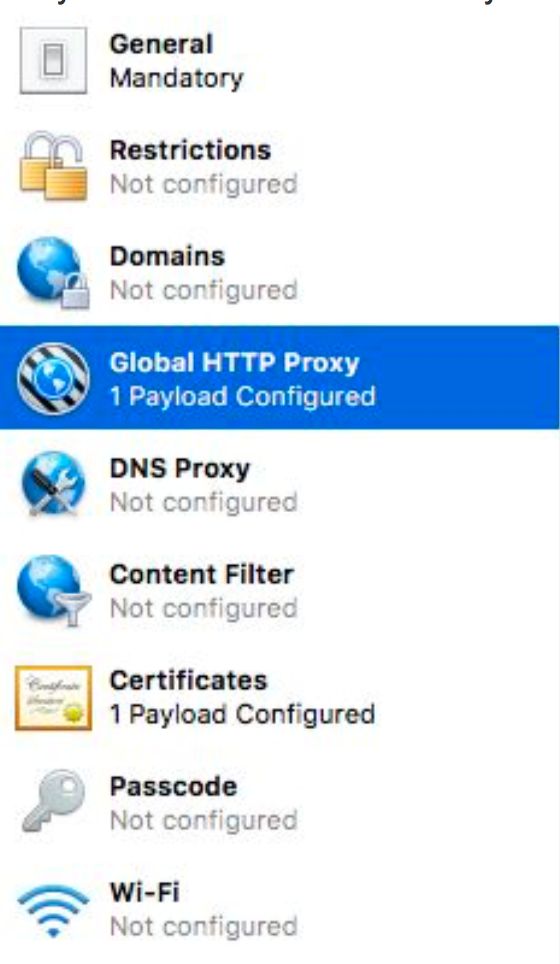 Verify that both Global HTTP Proxy and Certificates show 1 Payload configured.