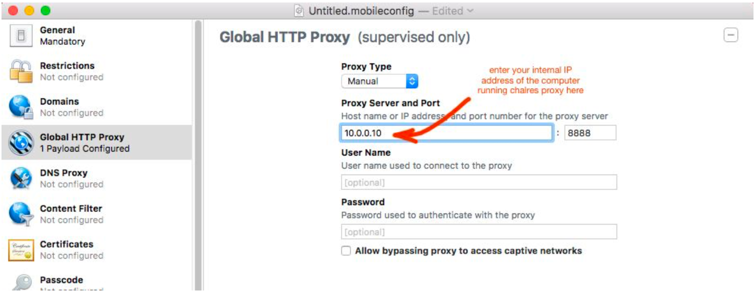 Input the IP address of the machine running Charles and 8888 (default) for the port.