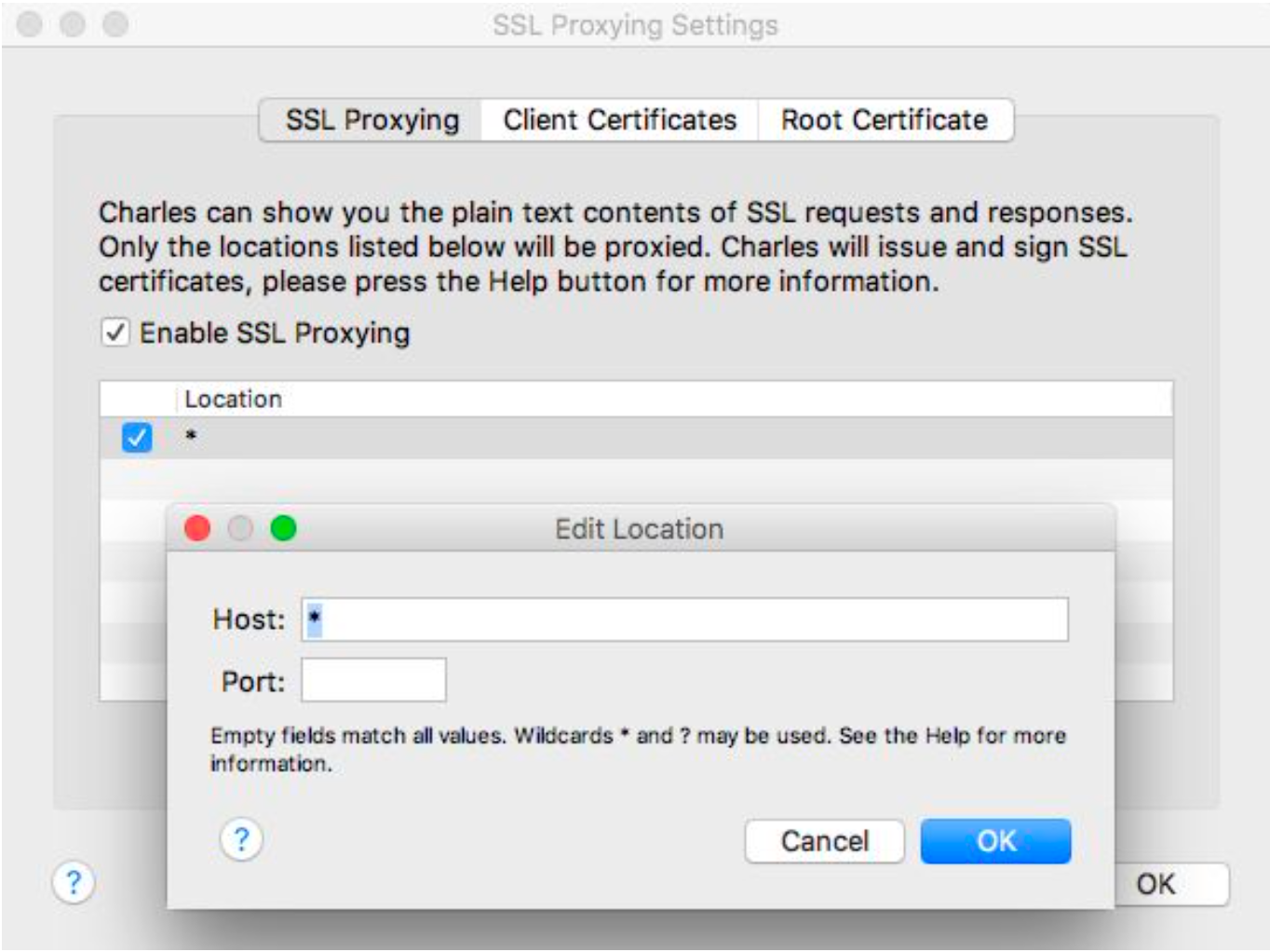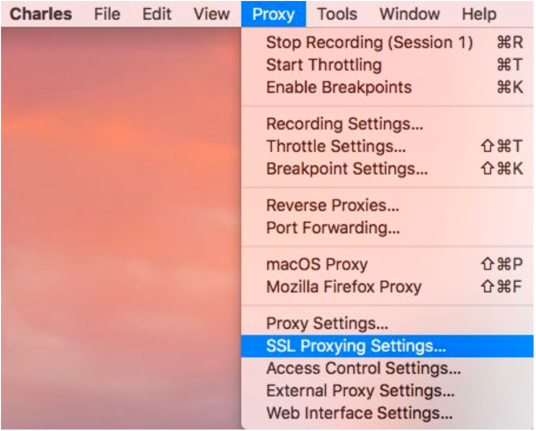 In Charles Proxy, open Proxy > SSL Proxying Settings.