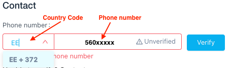 Select your country's phone code by entering your phone code (such as +372 for Estonia) or the ALPHA-2 country code (such as EE for Estonia).