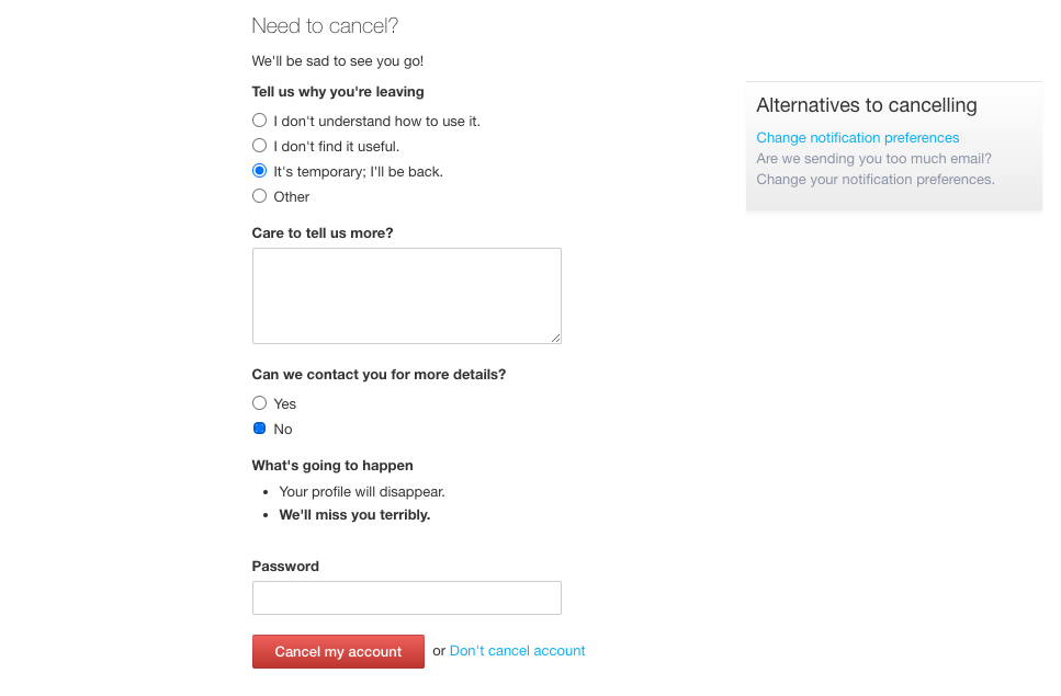 A new window will open where you can leave your feedback and cancel your account. We would highly value your feedback regarding the reason behind the cancellation of your account.