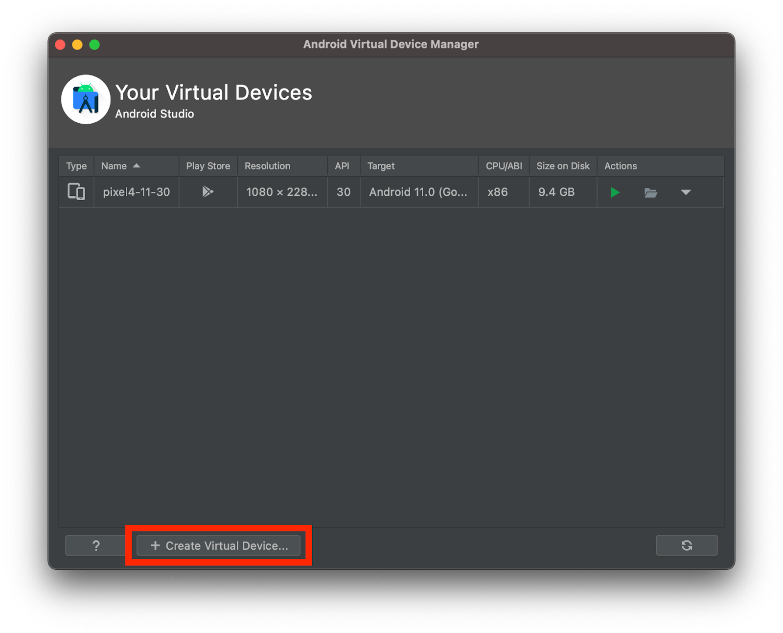 Create Virtual Device button on the Android Virtual Device Manager window