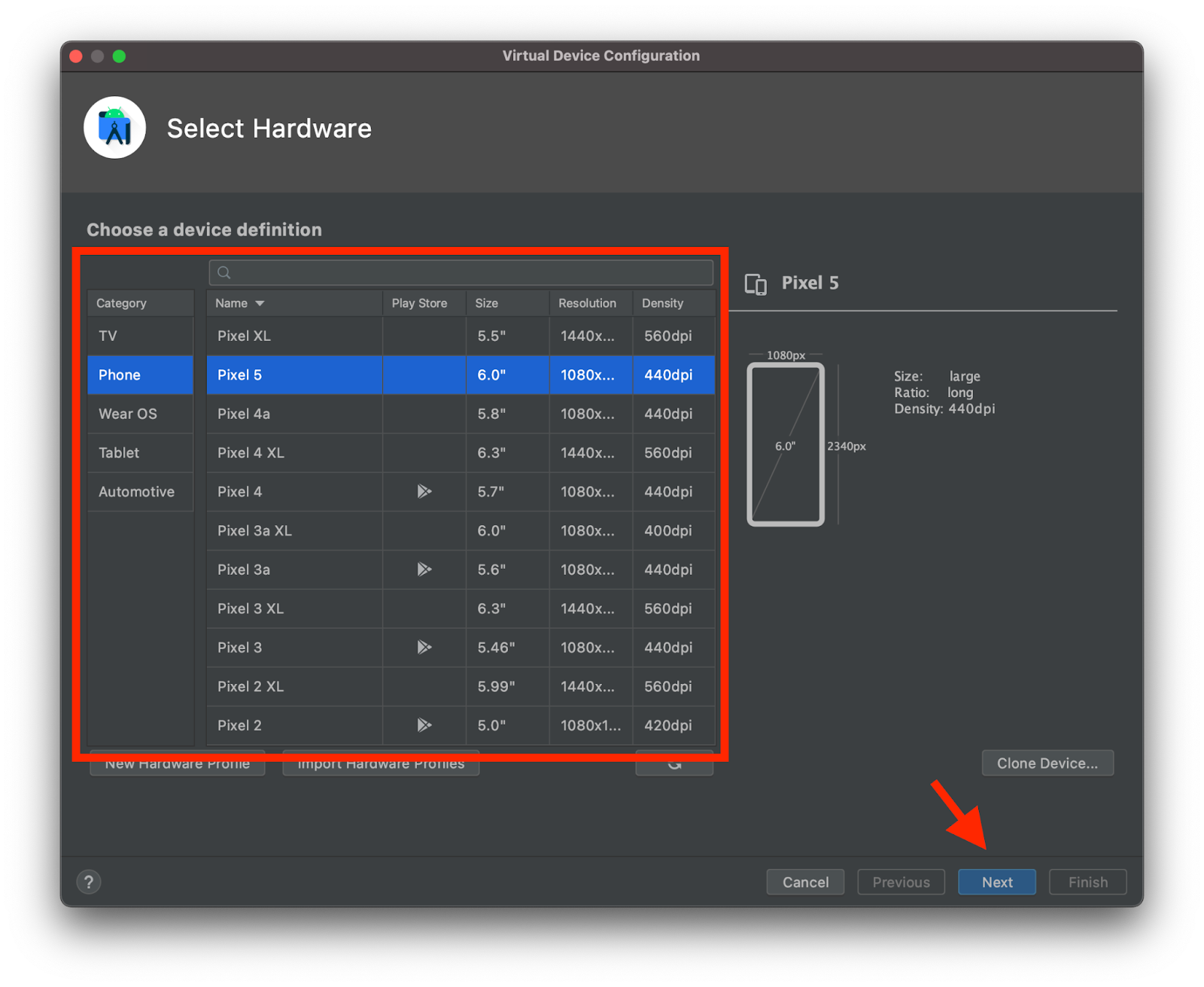 On the Virtual Device Configuration window choose an Android device model you want to emulate and then click Next