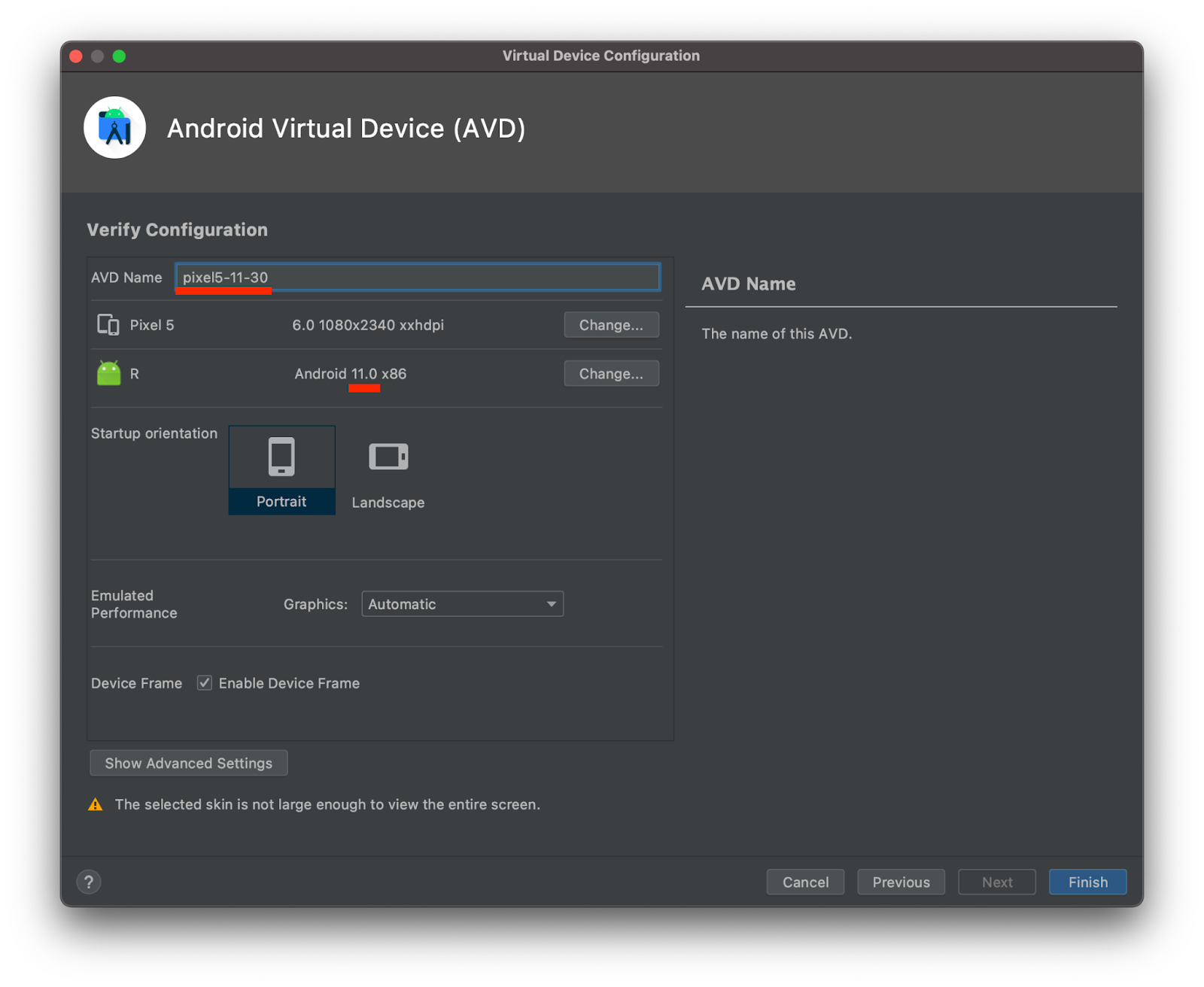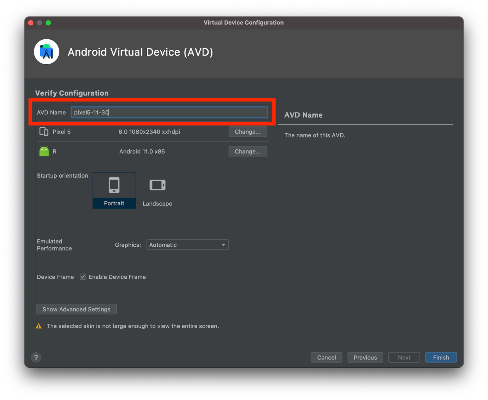 On the latest step, we would recommend specifying a custom AVD Name to be able easily to identify the device when using it for testing. Try to avoid using spaces in the name by replacing it with dashes or underscores.
