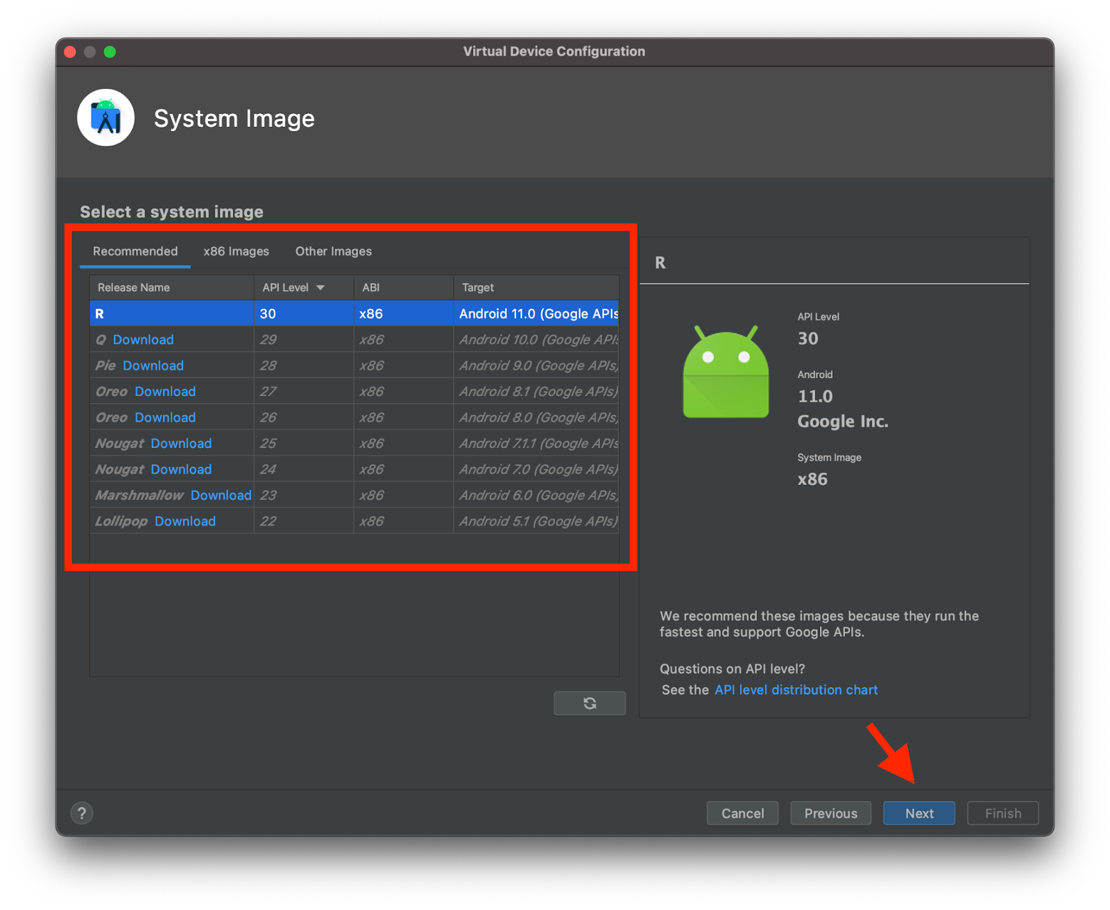On the following step select an Android system image you prefer to be installed on the device and click Next.