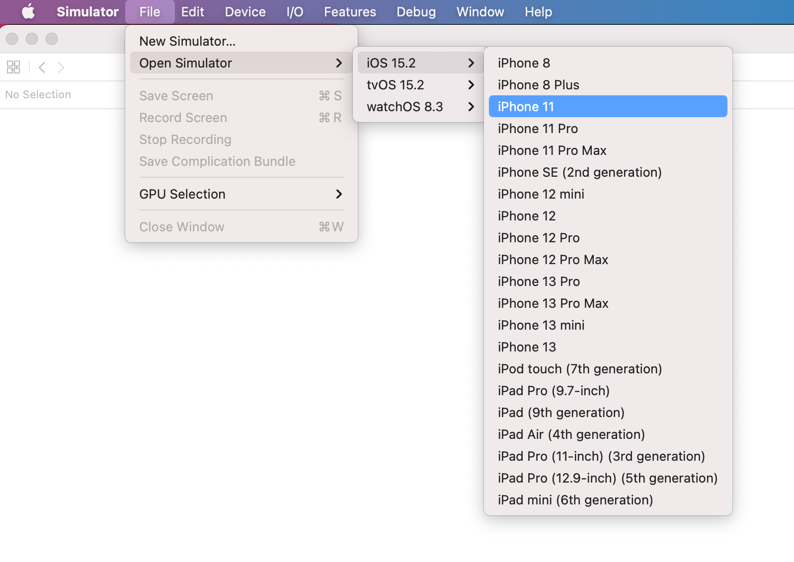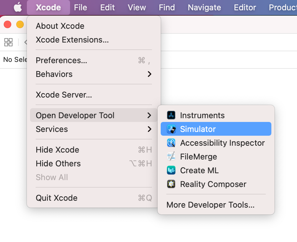 Simulator item in the XCode top panel menu