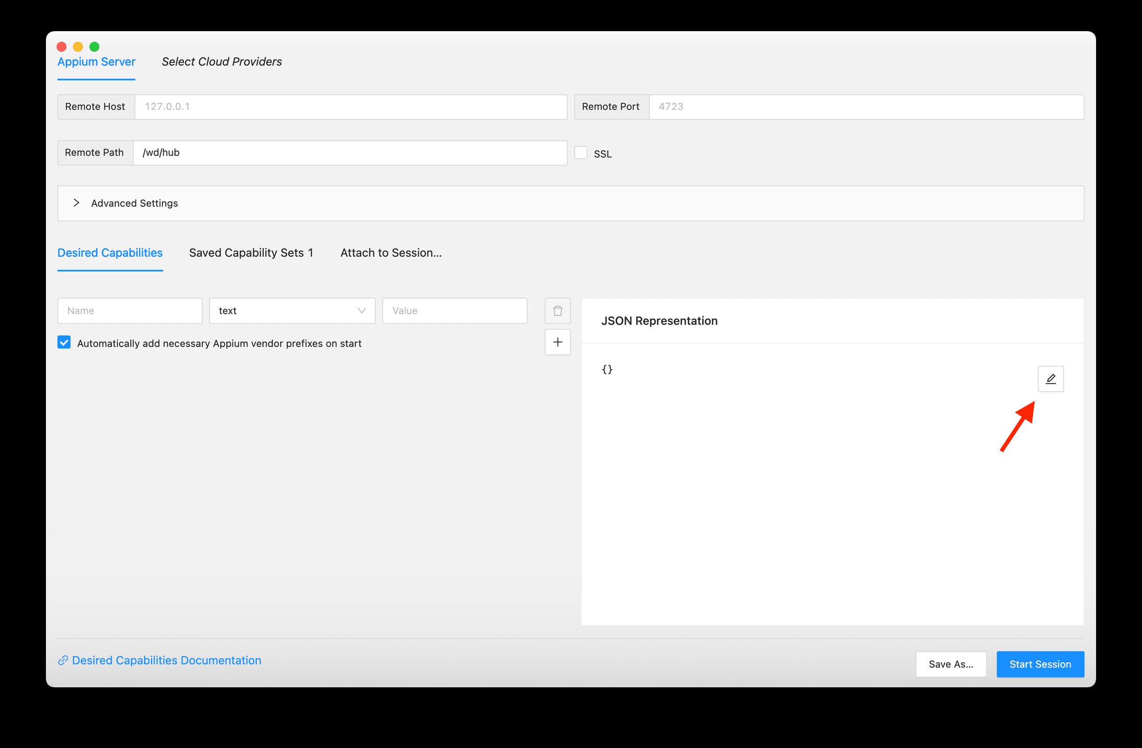 Launch the Appium Inspector session