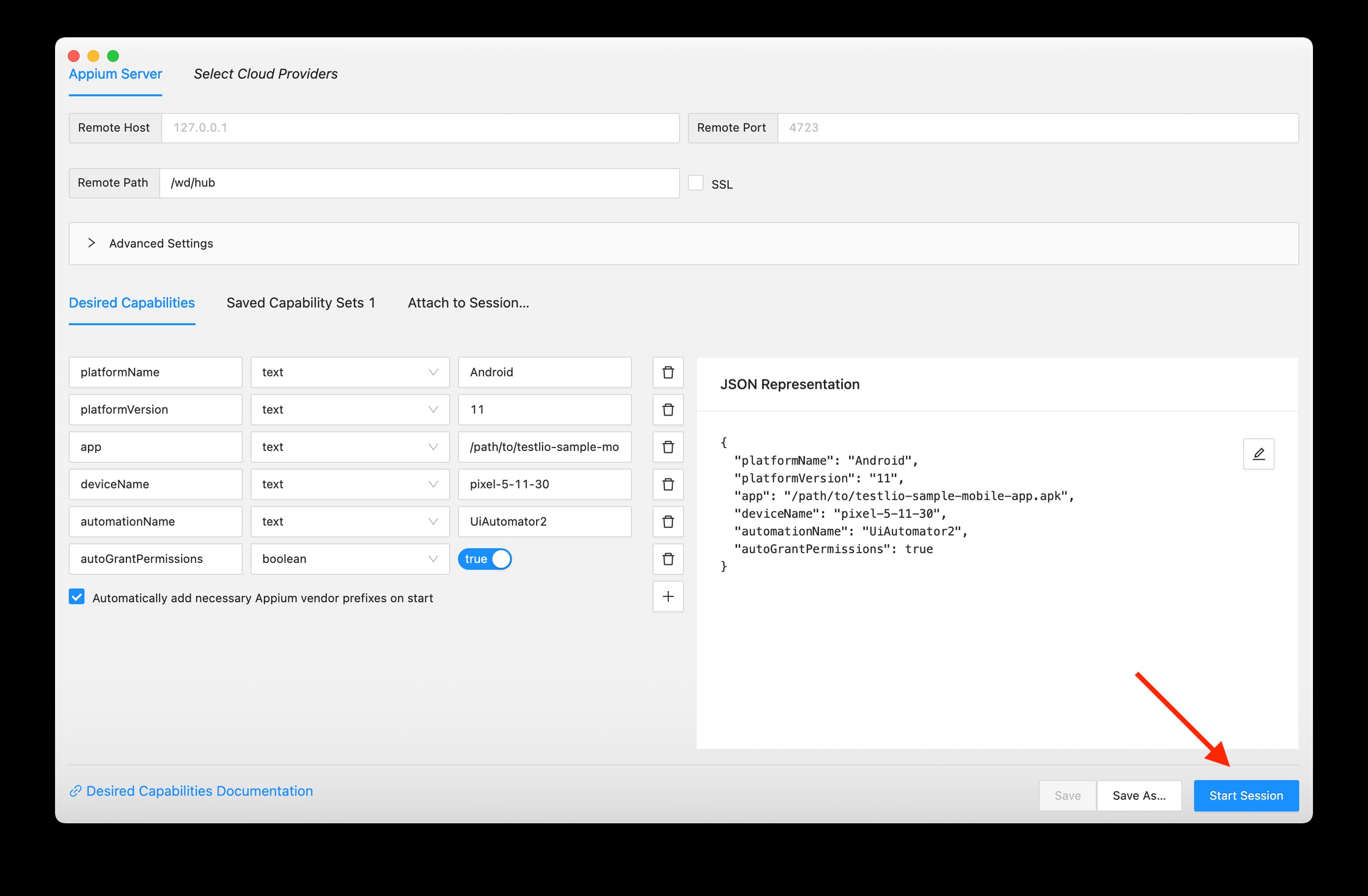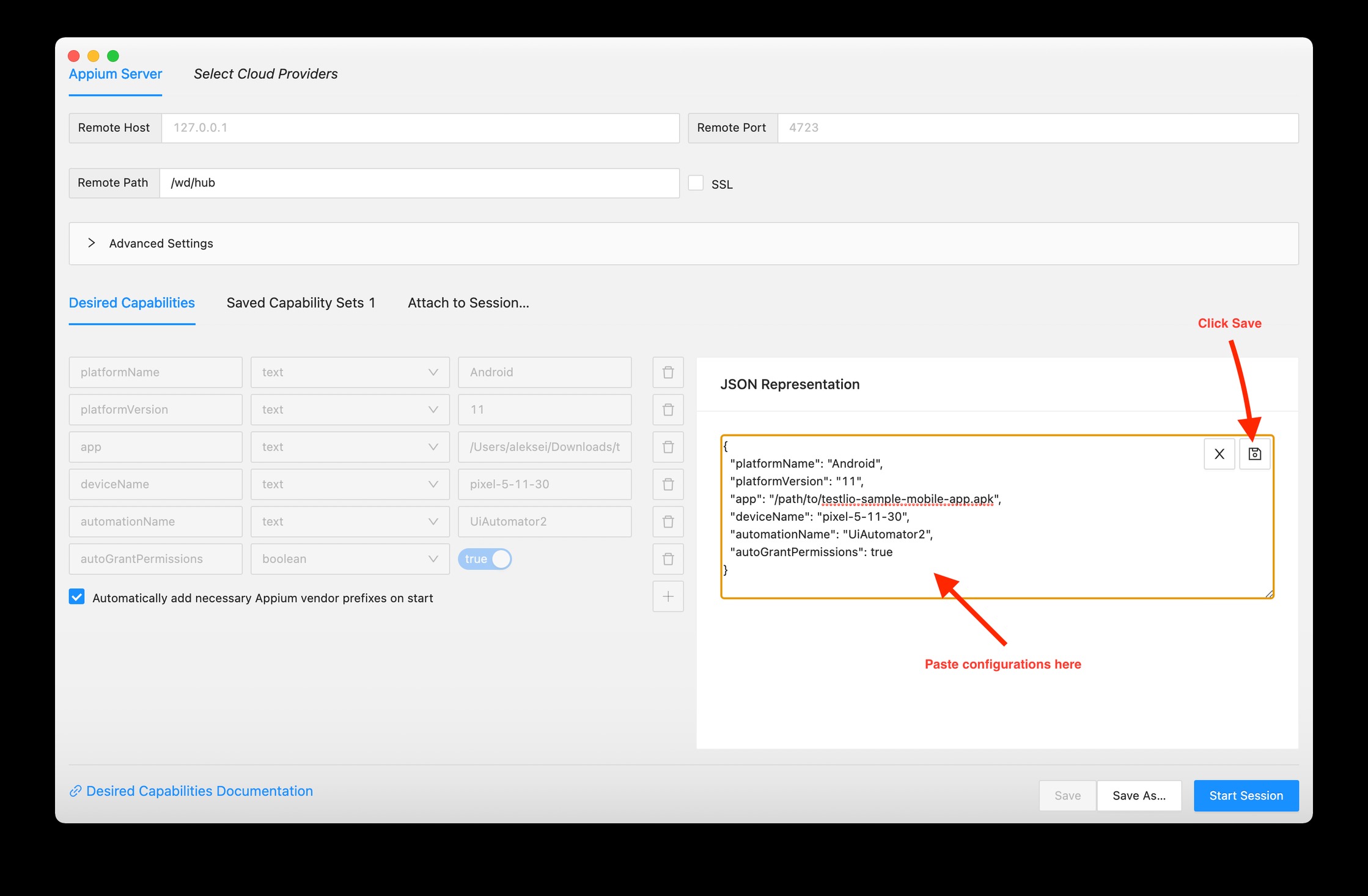 Note: Don’t forget to put the proper platform version appium:platformVersion and device name appium:deviceName you noted before and path to the apk file appium:app you have downloaded