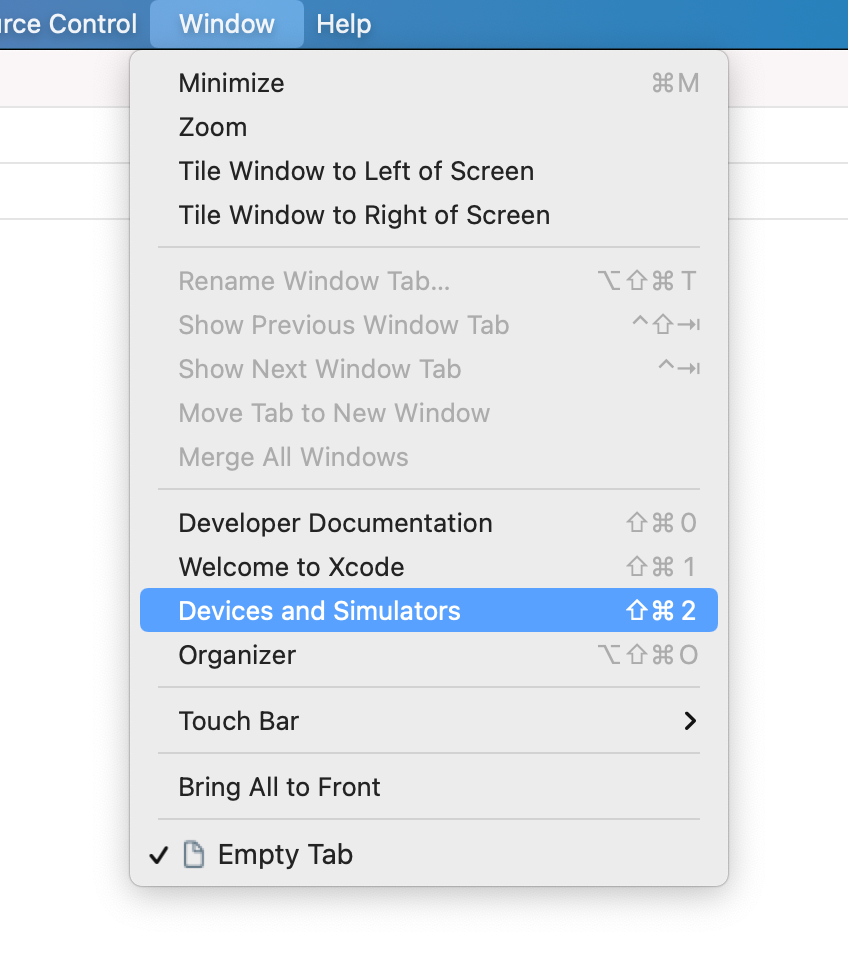 Devices and Simulators menu item in XCode