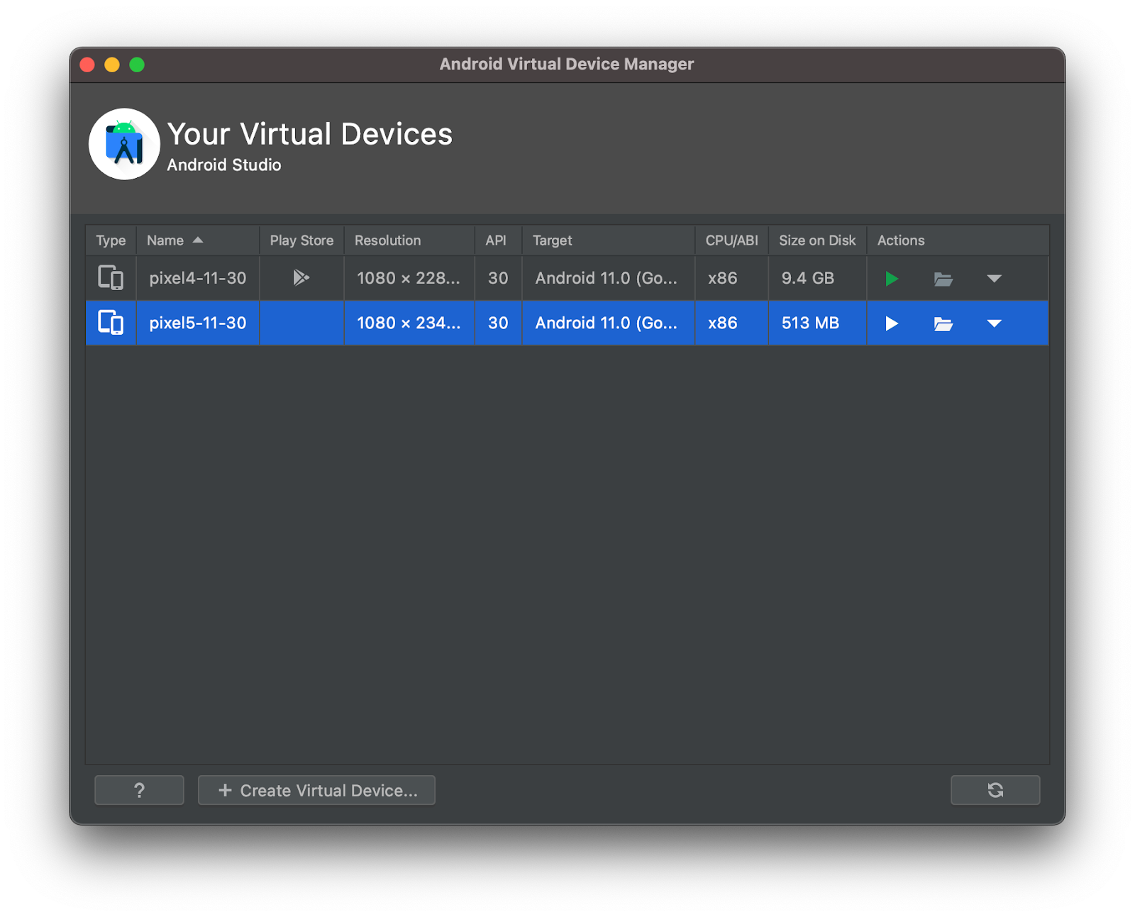 Click Finish when you’re done with a device configuration. The created device will immediately appear in your Android Virtual Device Manager devices list.