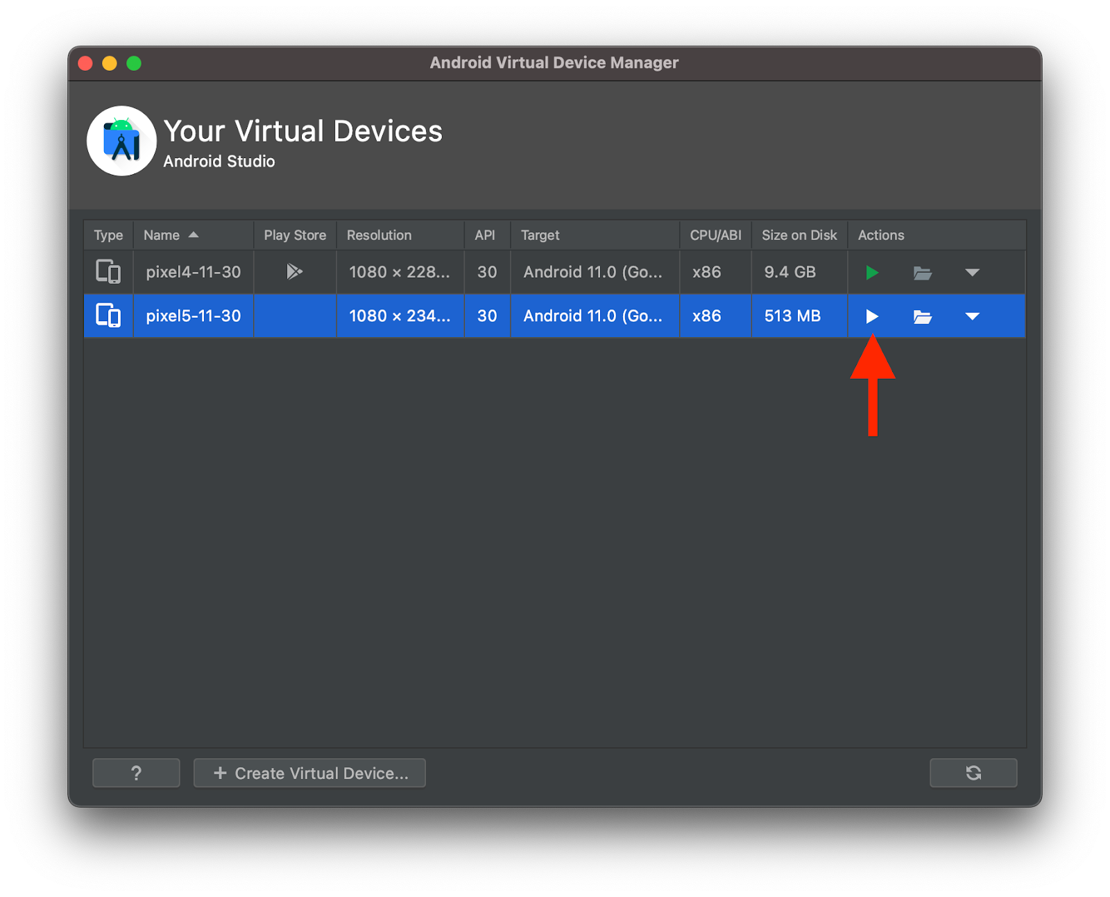 Launch Virtual Device button