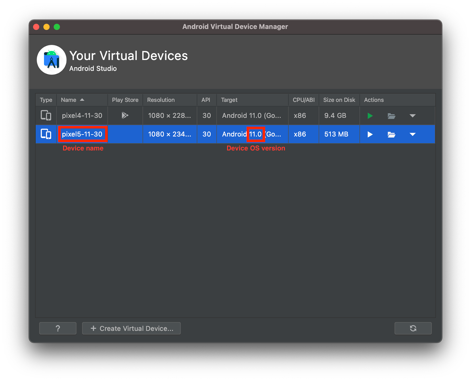 On the Android Virtual Device Manager window find the device you’re going to use and note values from Name and Target columns as shown on the screenshot below: