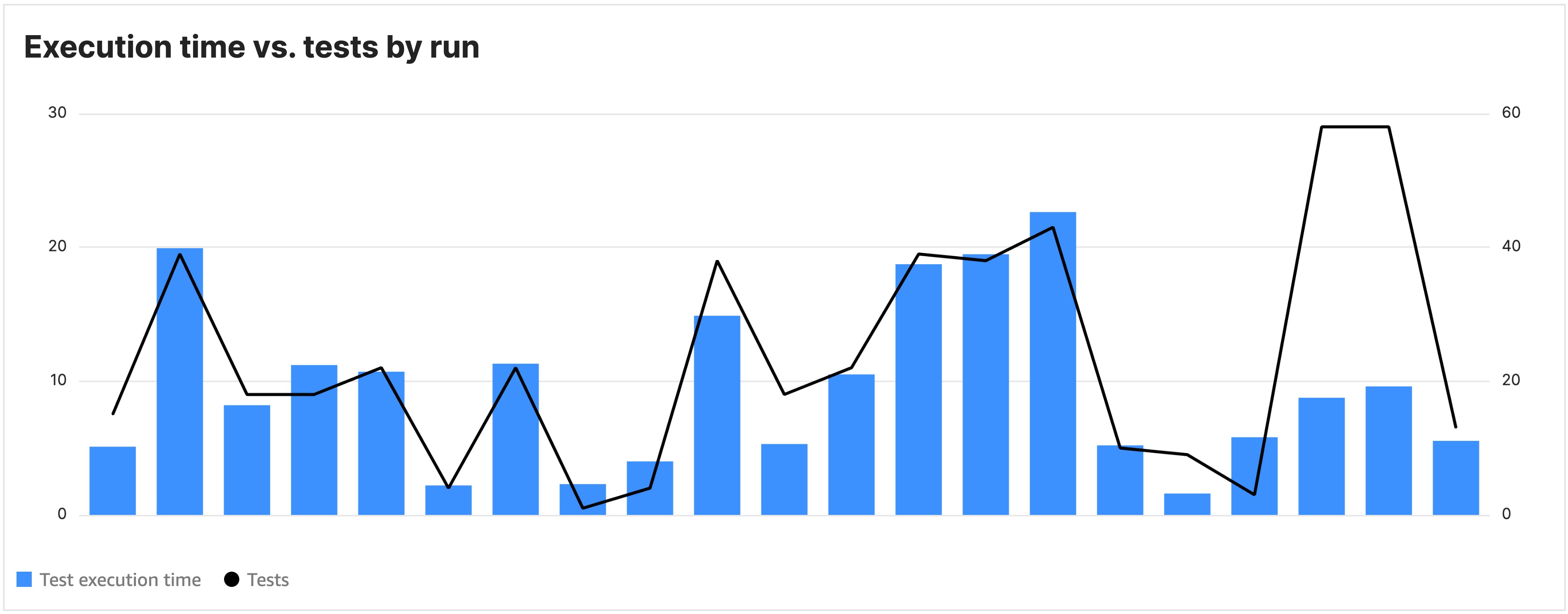Execution Time Vs. Tests by Run | A visual comparison of the total testing time with the number of tests per run. | This metric provides visibility into the efficiency of test execution. It can help identify opportunities to optimize test coverage. Differences may arise due to variations in test types (such as sanity, regression, smoke).