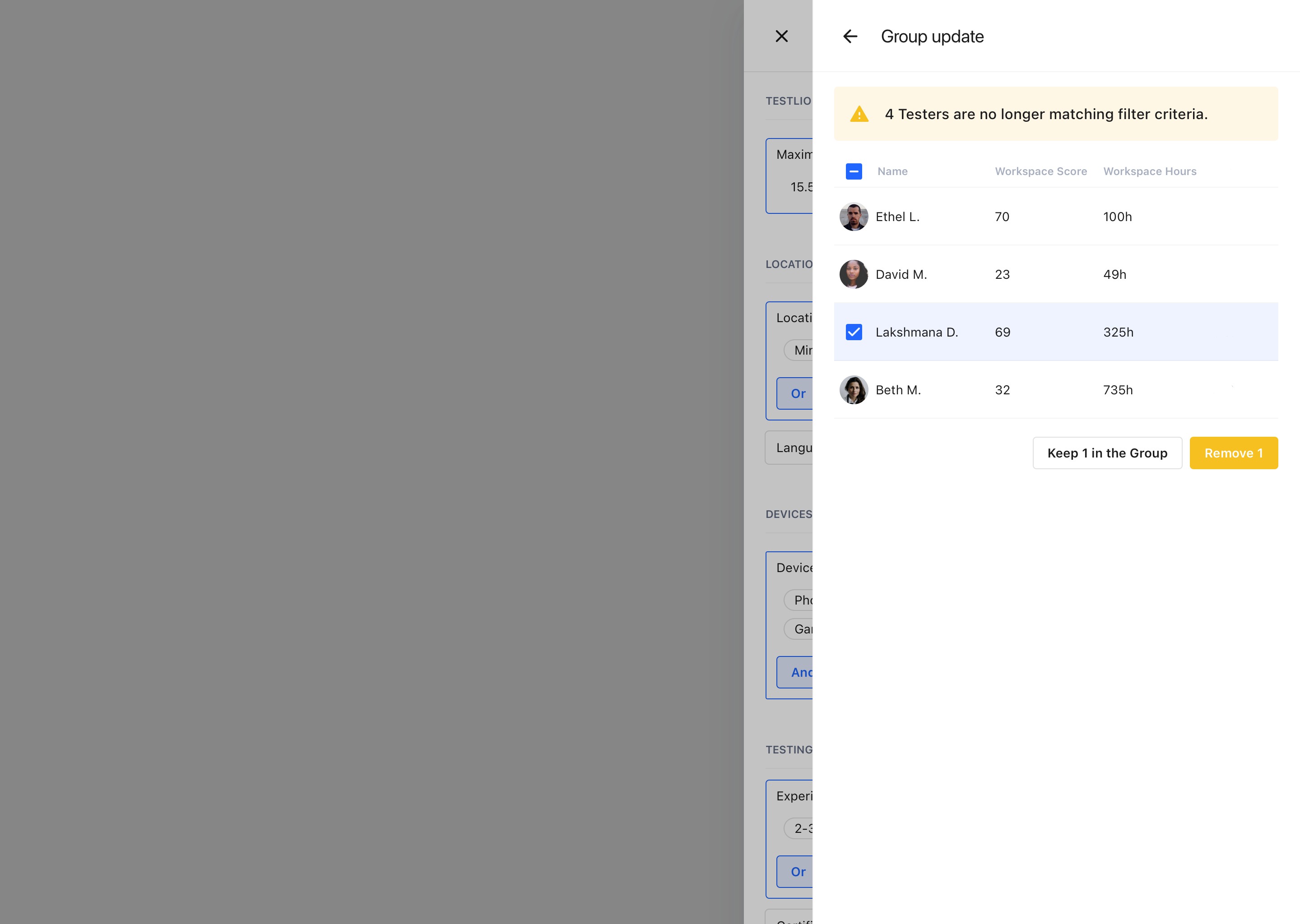 Example of Group filters update. Users can decide to either keep or continue removal of the non-matching Testers
