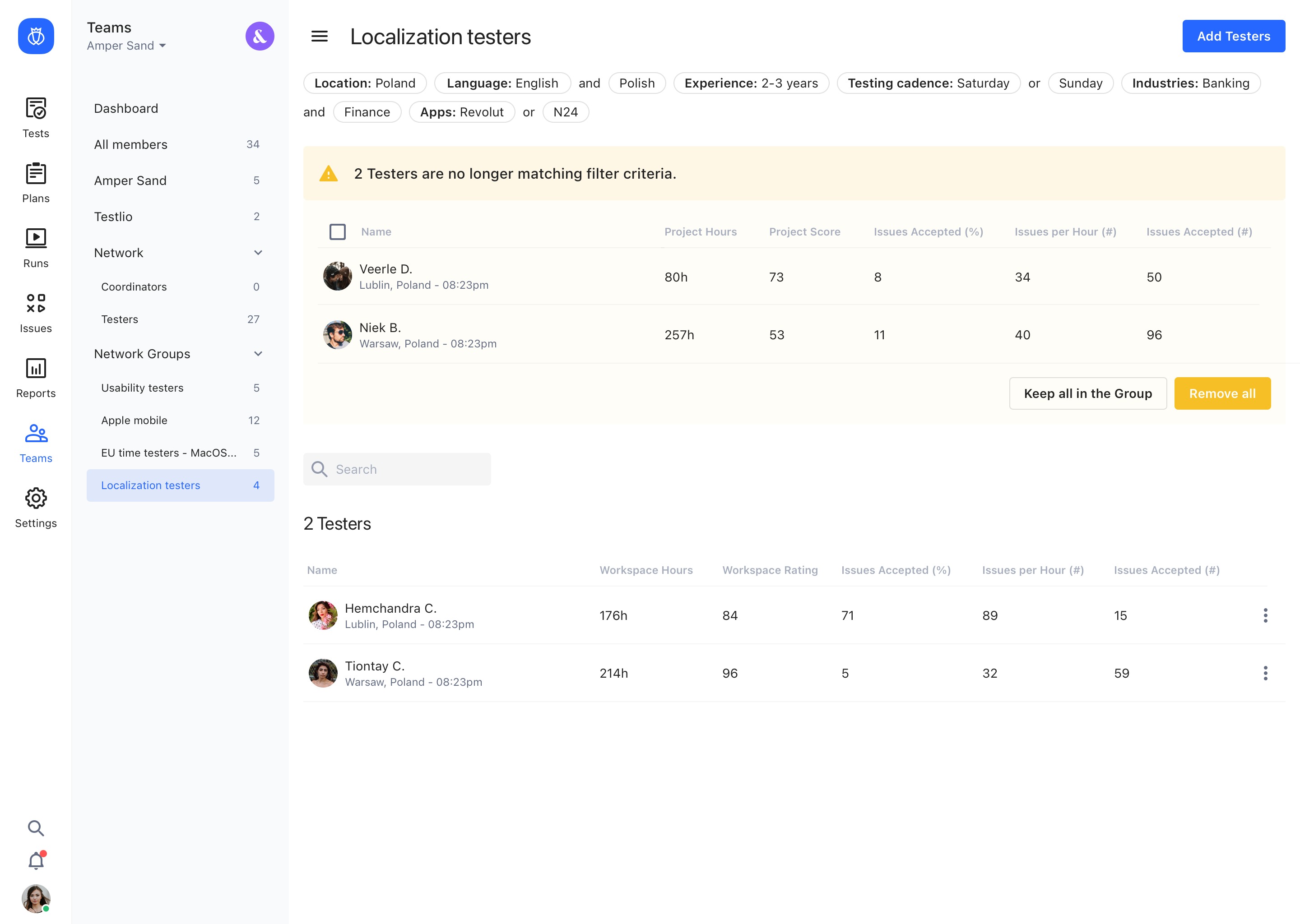 • Tester will be removed from the Group but still be part of the Workspace (even if you removed them from the last Group they were part of)