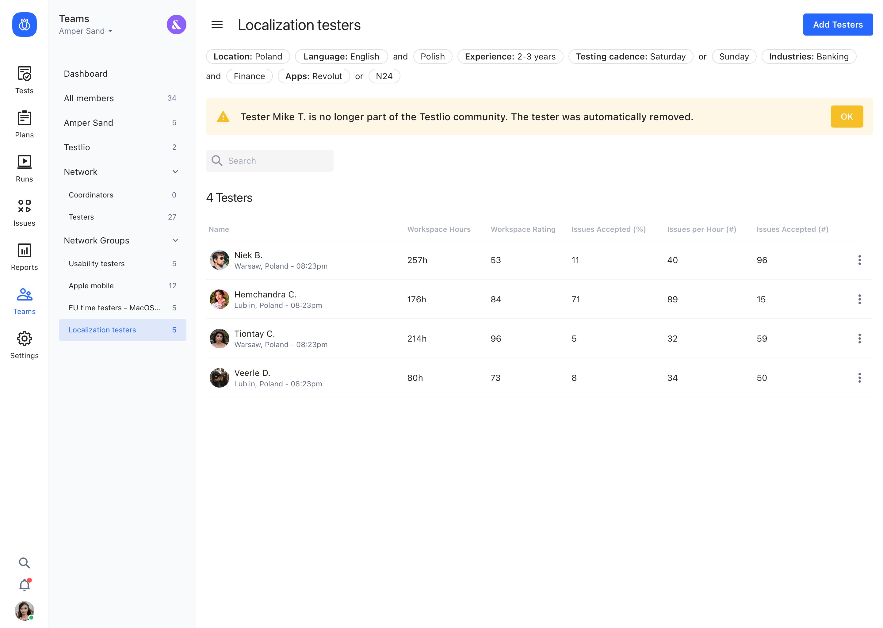 A similar notification is shown when any member of the Network team leaves or is offboarded due to a specific reason. In both cases, Testers are automatically removed from the Group, and the Workspace.